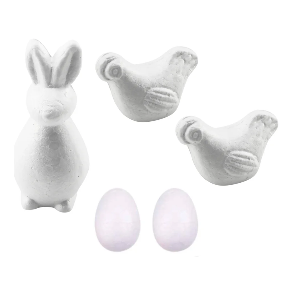 W skład zestawu wchodzi styropianowy zajączek o wysokości 10 cm, dwie kury o wymiarach 7 x 5 cm oraz dwa jajka o wysokości 5 cm. Dodatkowo dołączono farby w czterech intensywnych kolorach oraz pędzelek, który ułatwia precyzyjne malowanie detali.