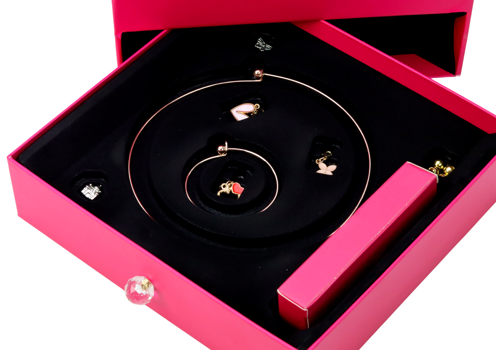 Na dolnej półce, którą możesz wysunąć, znajdziesz różowe opakowanie z kolorowymi sznureczkami, zawieszkami oraz złotym naszyjnikiem, który stanowi idealną bazę do zawieszania koralików i zawieszek, tworząc tym samym niepowtarzalne i wyjątkowe dzieła sztuki.