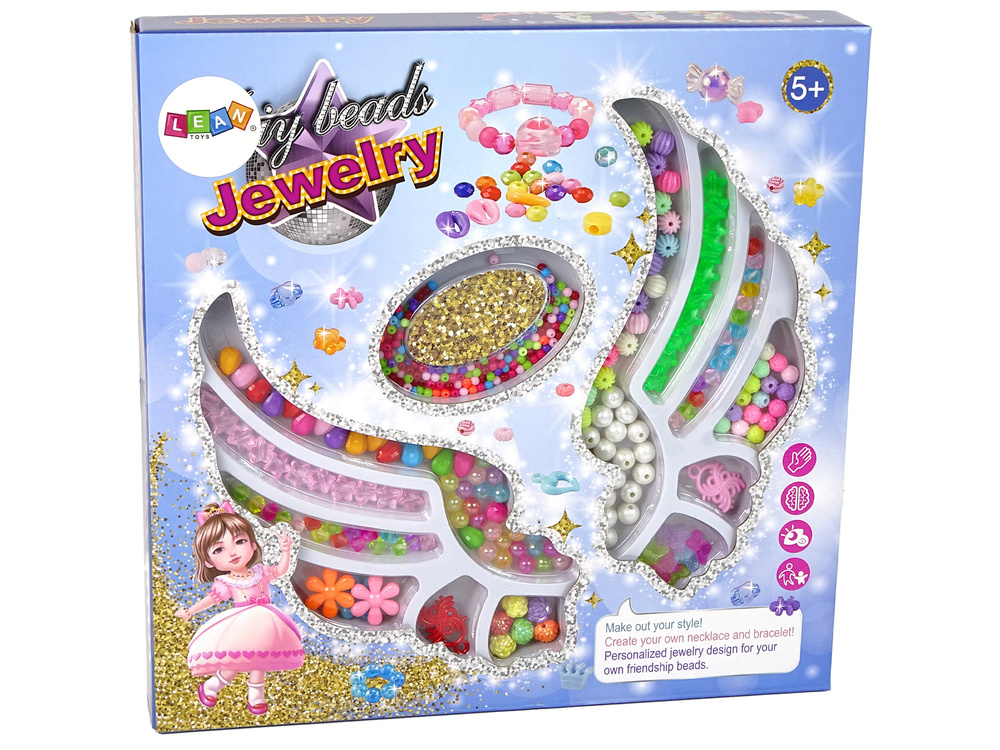 Zestaw składa się z najróżniejszych koralików w kształcie kwiatuszków, perełek, gwiazdek czy diamencików. Wybór jest ogromny i mała artysta może stworzyć łańcuszki czy bransoletki w niepowtarzalnych wzorach. Do zestawu dołączone są sznurki, na które wystarczy nawlec koraliki.