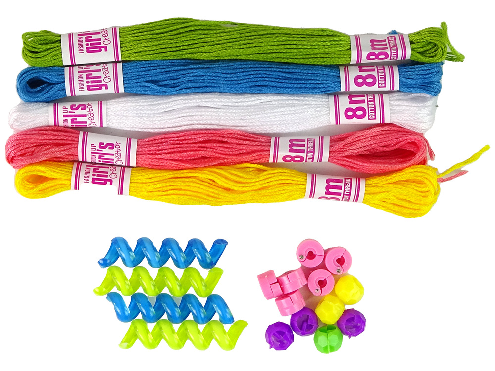 Zestaw zawiera bogactwo koralików w odcieniach różu, żółci, fioletu, zieleni, niebieskiego i pomarańczowego, otwierając przed Tobą nieskończone możliwości tworzenia. Pięć ośmiometrowych nitek bawełnianych w zielonym, niebieskim, białym, różowym i żółtym kolorze pozwoli na wykreowanie zróżnicowanych stylizacji. Do tego dołączony jest niebieski grzebyk do włosów dla wygody.