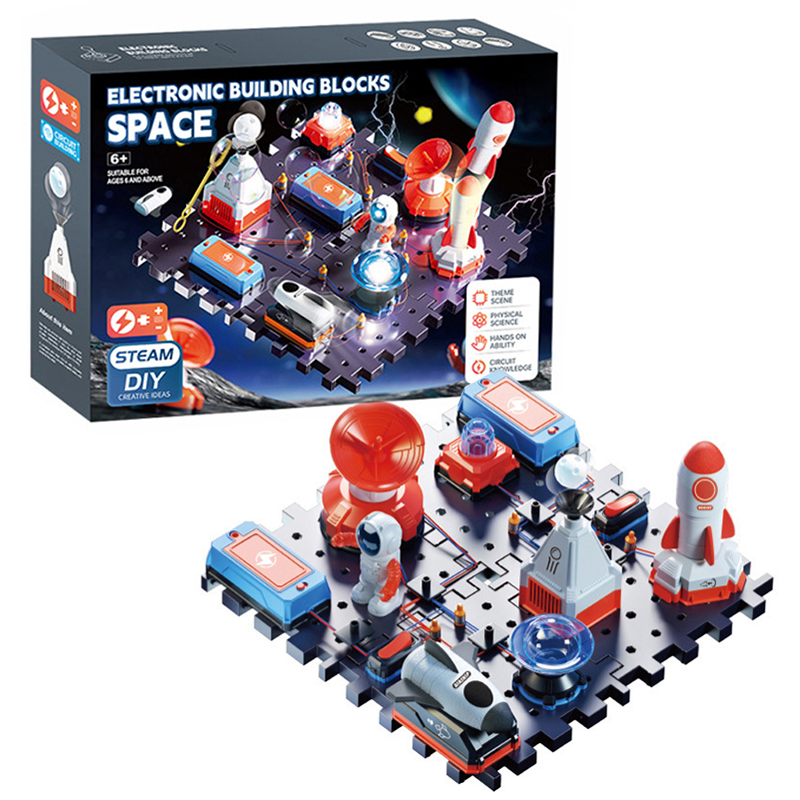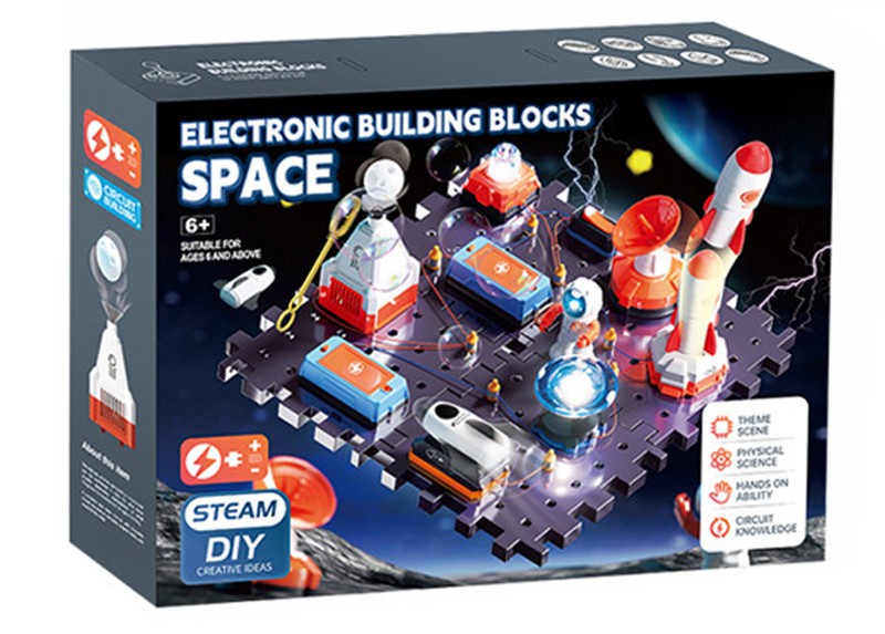 Zestaw przenosi naukę o obwodach elektrycznych z nudnej wiedzy do trójwymiarowego świata nieskończonych, kosmicznych przygód. Gdy dziecko wszystko prawidłowo połączy będzie miało możliwość uruchomić różne elementy bazy kosmicznej.