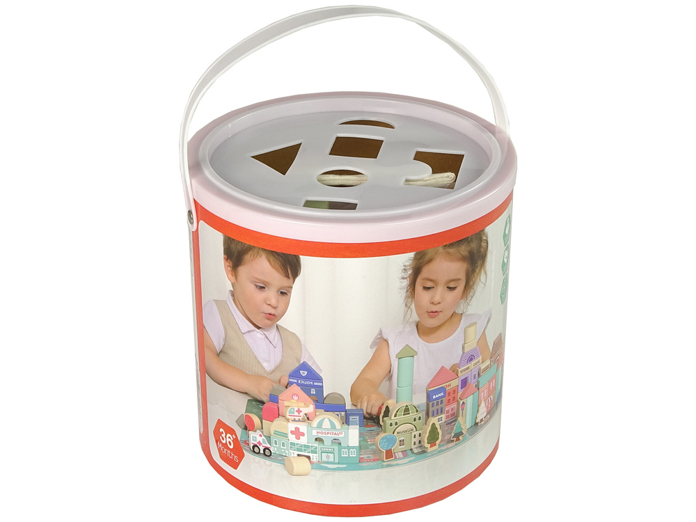 Klocki zapakowane są w kolorowe wiaderko na górze, którego znajduje się sorter w różnych kształtach do których należy dopasować odpowiednie klocki.