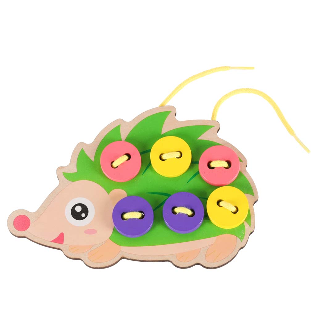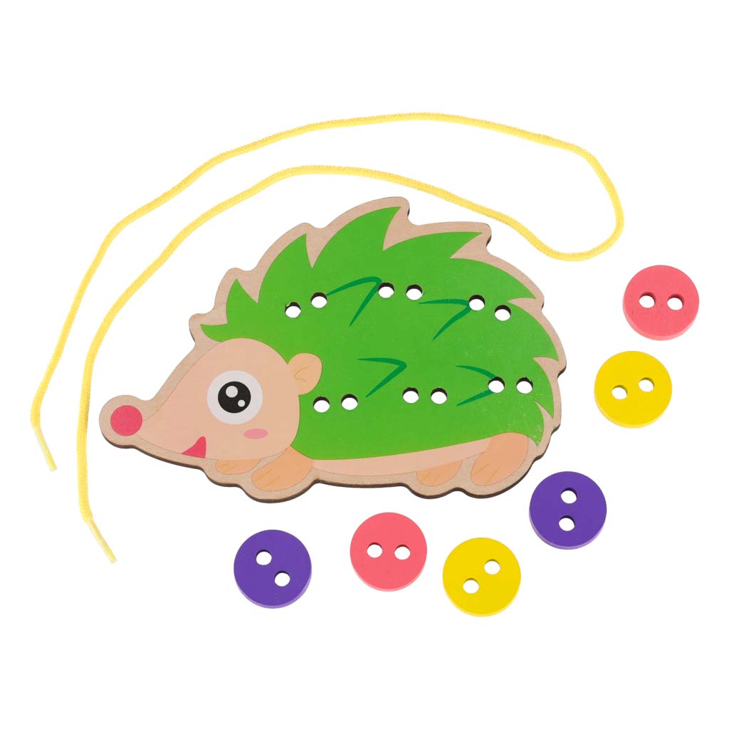 Ta zabawka edukacyjna zachęca do twórczej zabawy. Dzieci będą przeplatać sznureczek przez dziurki, przymocowując guziczki do sympatycznego jeżyka. Można także wykorzystać kolorowe koraliki i inne elementy, aby zabawa była jeszcze ciekawsza.