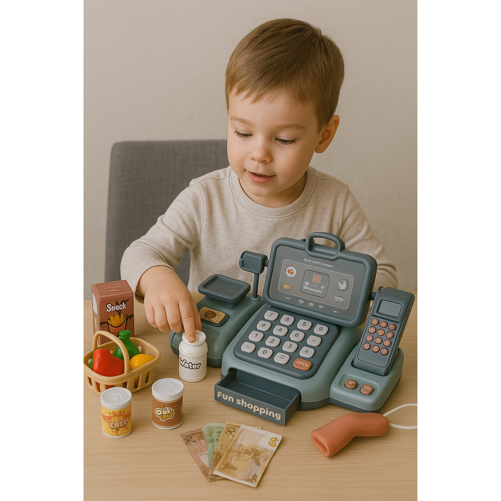 Jednym z najciekawszych elementów kasy jest aktywny skaner, który dodaje zabawie interaktywności. Skaner rozpoznaje produkty, wypowiada ich nazwy w języku angielskim oraz nalicza odpowiednią cenę, co nie tylko uczy dzieci nowych słów, ale także pozwala im zrozumieć, jak działa proces zakupowy. Oprócz tradycyjnej płatności gotówką, dzieci mogą również dokonywać płatności kartą płatniczą, co wprowadza element nowoczesności i realizmu do zabawy.