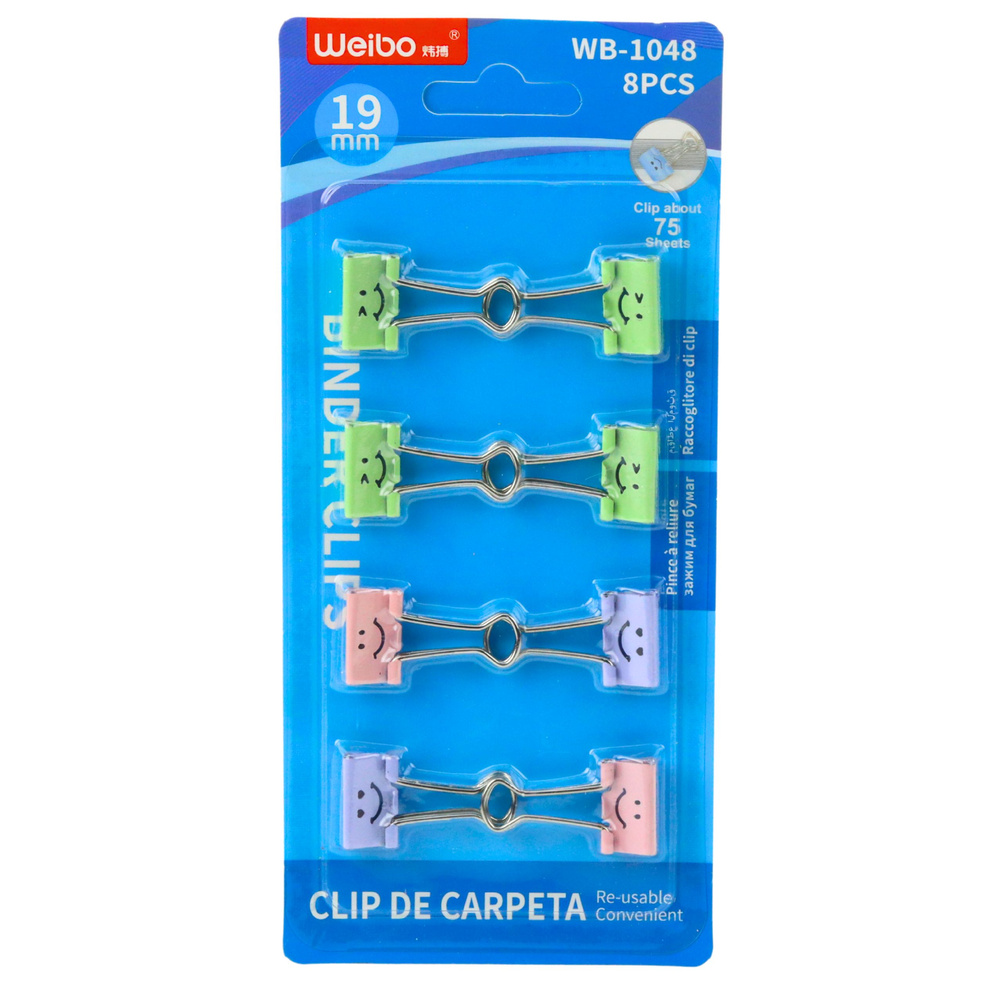 Kolorowe klipsy biurowe z buźkami to funkcjonalne i estetyczne akcesorium do organizowania dokumentów w szkole, biurze lub domu. Zestaw zawiera 8 metalowych klipsów o szerokości 19 mm, które z łatwością spinają do 75 arkuszy papieru, dodając jednocześnie uśmiechu codziennej pracy i wprowadzając pozytywny nastrój do otoczenia.