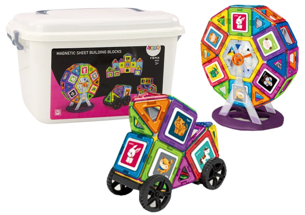 Zestaw klocków magnetycznych to doskonała propozycja dla dzieci, które uwielbiają tworzyć, eksperymentować i rozwijać swoje zdolności konstrukcyjne. Dzięki 118 elementom zestaw oferuje nieograniczone możliwości budowania, pozwalając na tworzenie różnorodnych konstrukcji, takich jak koło młyńskie, budynki, autka oraz inne kreatywne projekty.