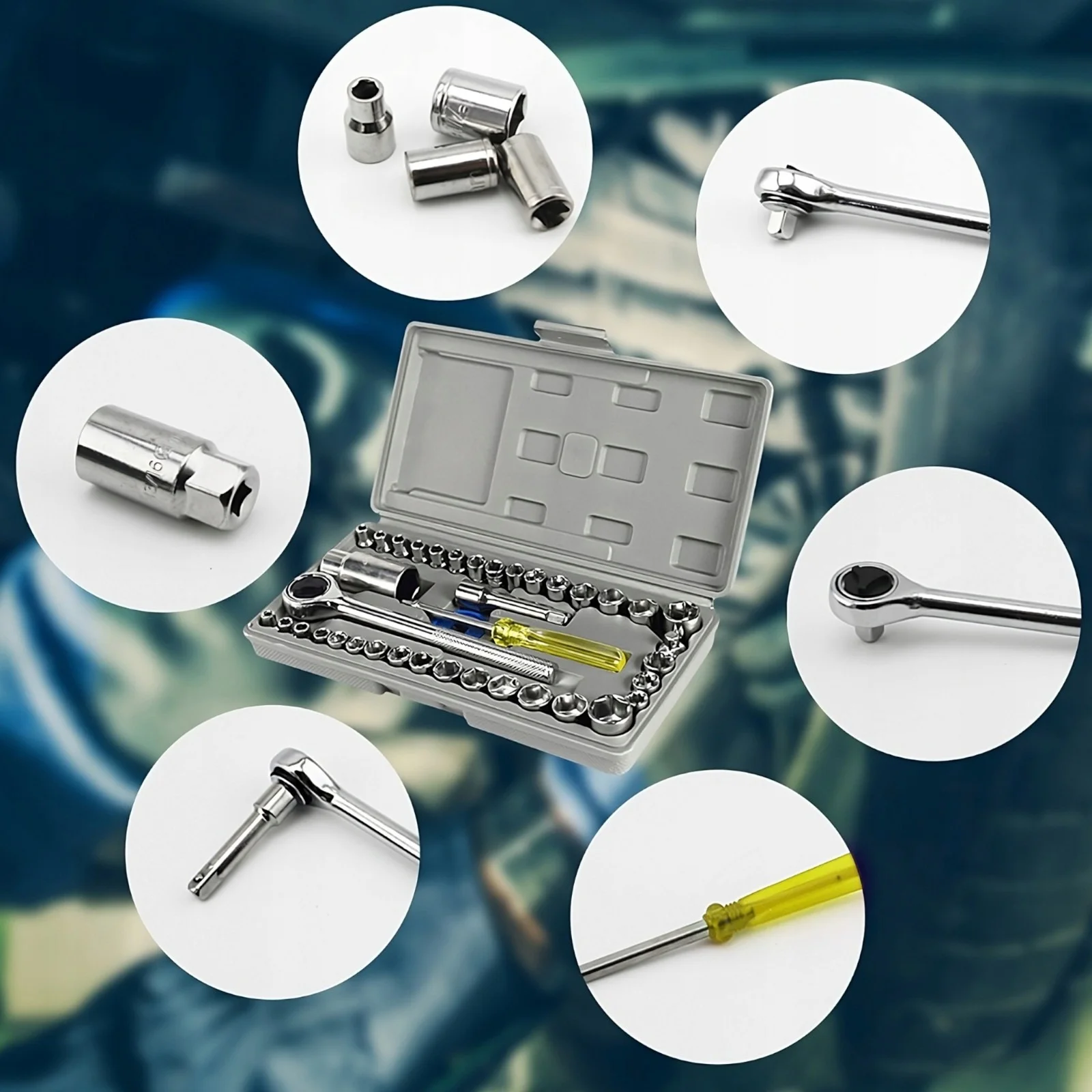 Zestaw kluczy nasadowych z grzechotką - 40 el. to profesjonalne narzędzie, które doskonale sprawdzi się w różnych pracach mechanicznych, budowlanych oraz domowych. Dzięki swojemu uniwersalnemu zastosowaniu, zestaw ten jest niezwykle funkcjonalny i praktyczny.