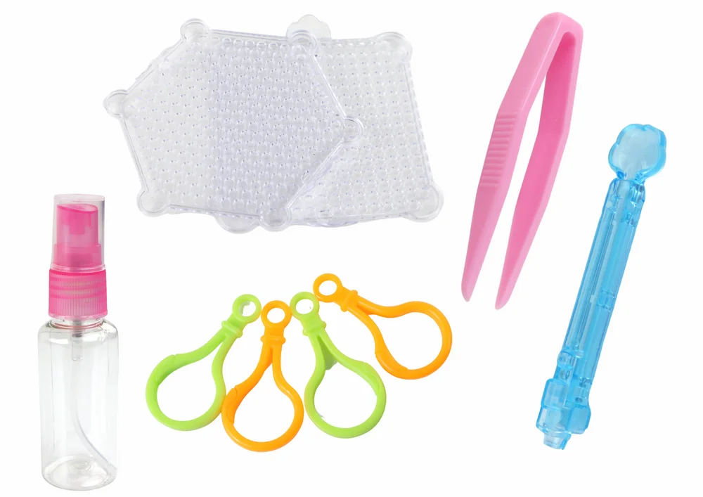 Dodatkowo zestaw zawiera dwie podstawki w kształcie kwadratu i sześciokąta, które umożliwiają tworzenie różnorodnych wzorów i kompozycji. Butelka na wodę pozwala na łatwe moczenie koralików, co umożliwia ich sklejanie.