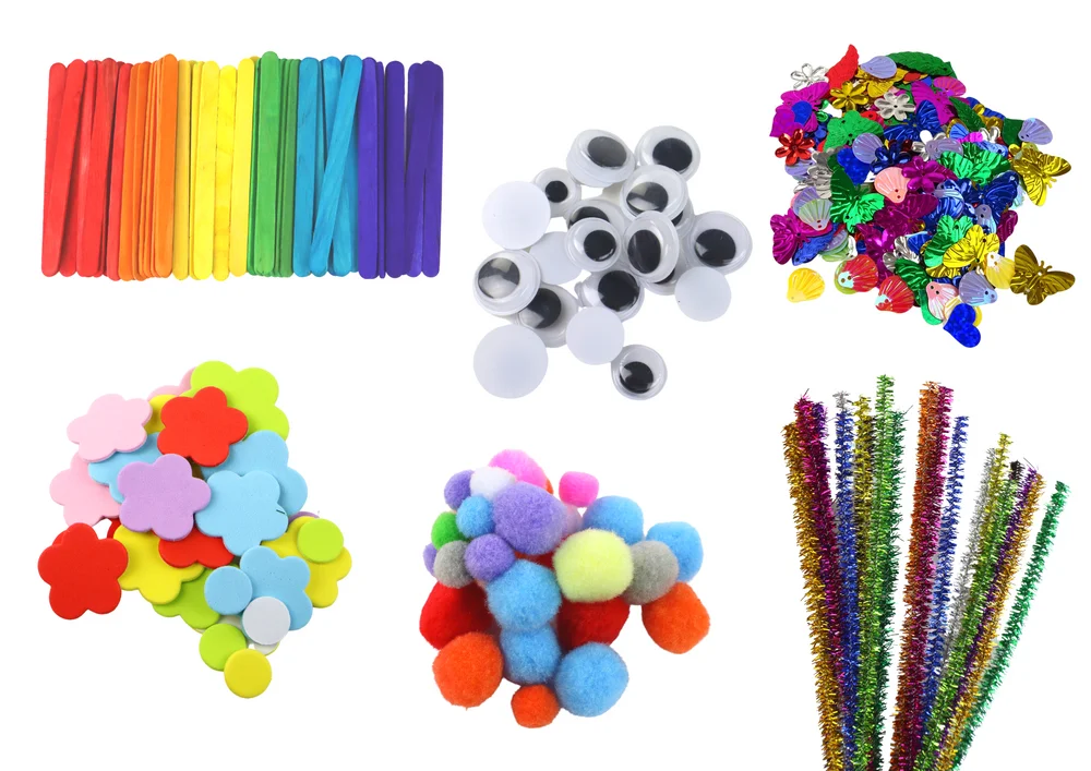- 2 zestawy pomponów w różnych kolorach i wielkościach,