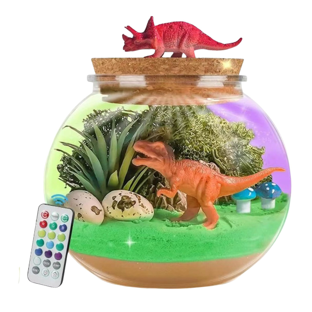 Dzieci mogą samodzielnie aranżować wnętrze terrarium, tworząc scenerię z piaskiem, roślinnością, figurkami dinozaurów i kamieniami. Gotowy zestaw nie tylko daje radość z tworzenia, ale również staje się piękną ozdobą pokoju – może pełnić funkcję lampki nocnej, wprowadzając przyjemny, bajkowy klimat.