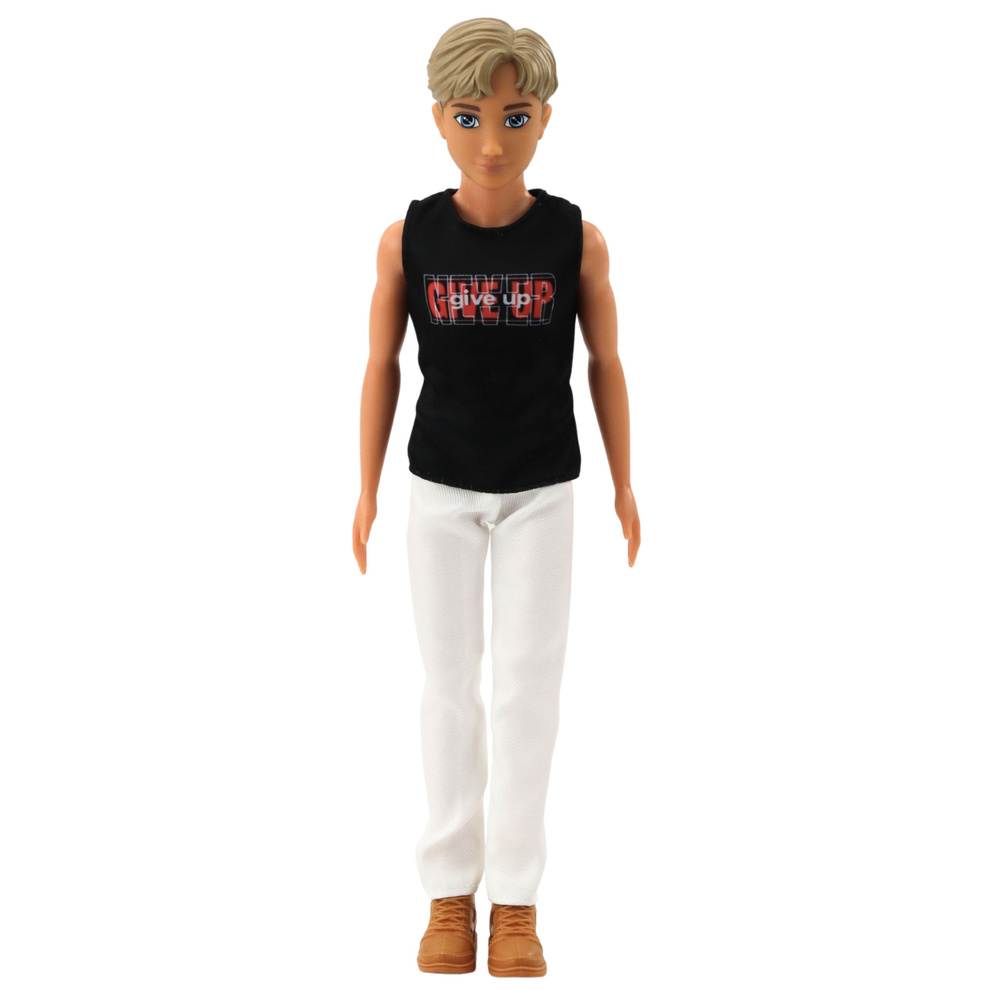 Lalka dziewczyna ma na sobie czerwoną sukienkę z geometrycznym wzorem oraz szare sandałki na koturnie. Jej długie blond włosy można czesać i stylizować. Stylizację uzupełnia słomkowa torebka oraz biały kapelusz z szerokim rondem – idealny na słoneczne dni. Chłopak ubrany jest w czarną koszulkę bez rękawów z nadrukiem oraz białe spodnie i brązowe buty, co tworzy modny, letni zestaw.