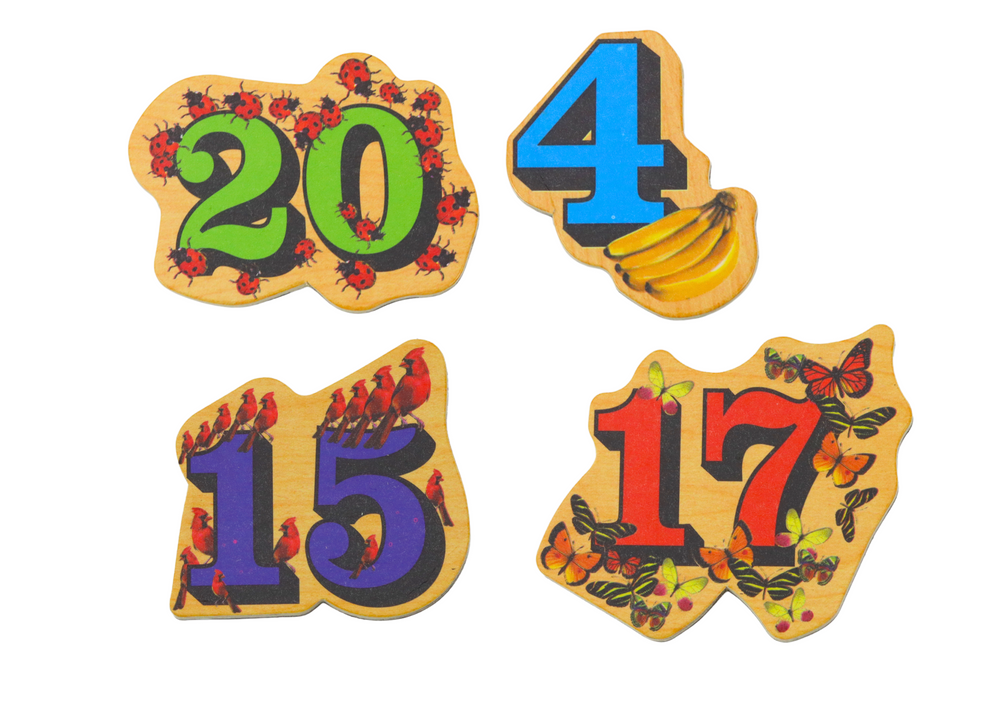 Zestaw drewnianych magnesów to edukacyjna zabawka, która zawiera 20 kolorowych magnesów, każdy z nich przedstawiający inną cyferkę oraz odpowiadającą jej liczbę zwierząt, owoców lub przedmiotów. Magnesy wykonane są z wysokiej jakości drewna, co zapewnia ich trwałość i bezpieczeństwo podczas zabawy.