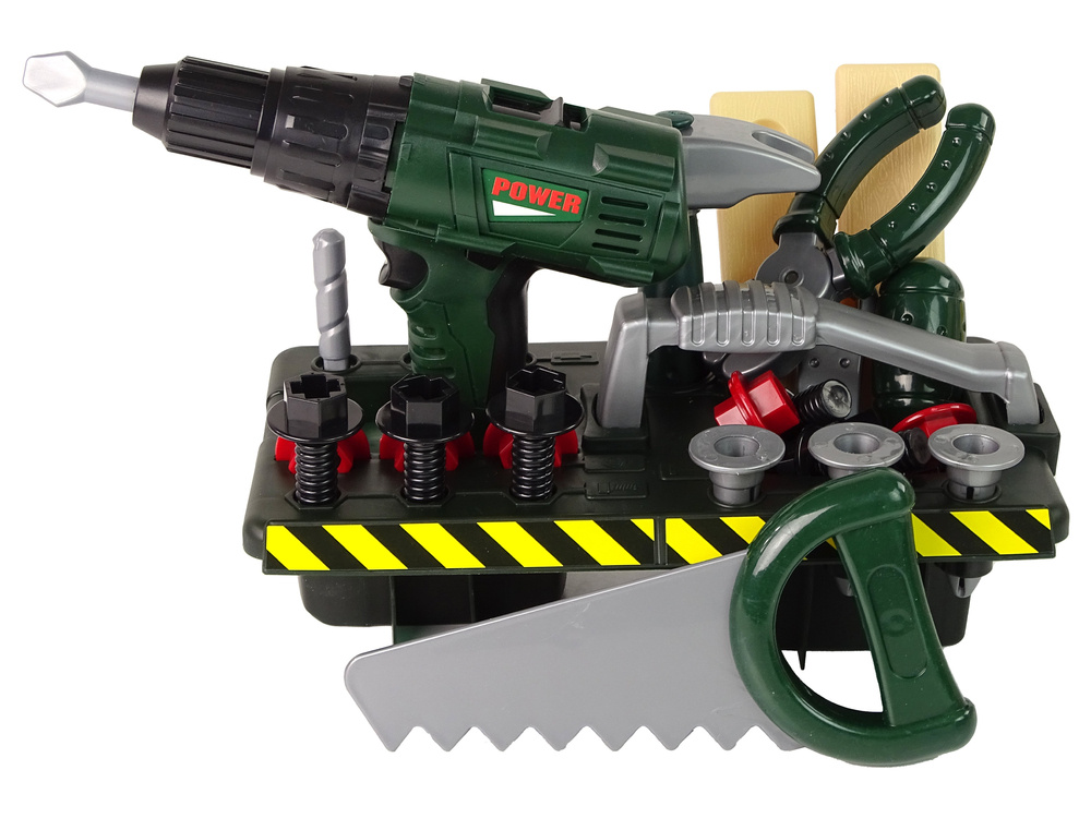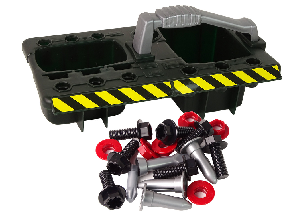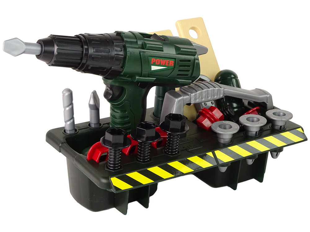 Organizer posiada dwie przegródki, jedna z nich pełni funkcję stojaka do wiertarki, druga szufladki na śrubki, nakrętki. Wszystkie narzędzia wykonane są z plastiku. Wkrętarka zasilana jest na baterie, po włożeniu baterii i naciśnięciu przycisku wiertło kręci się i dodatkowo wydaje realistyczny dźwięk.