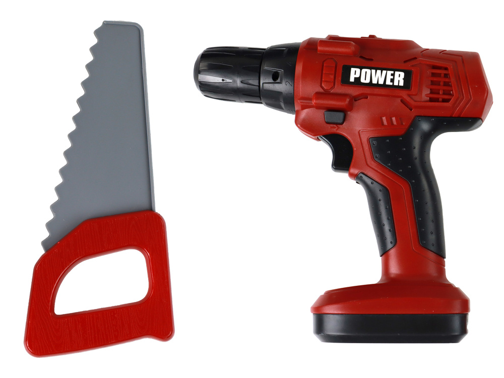 W zestawie znajduje się wiertarka w kolorze bordowo-czarnym, która jest naprawdę realistyczna.