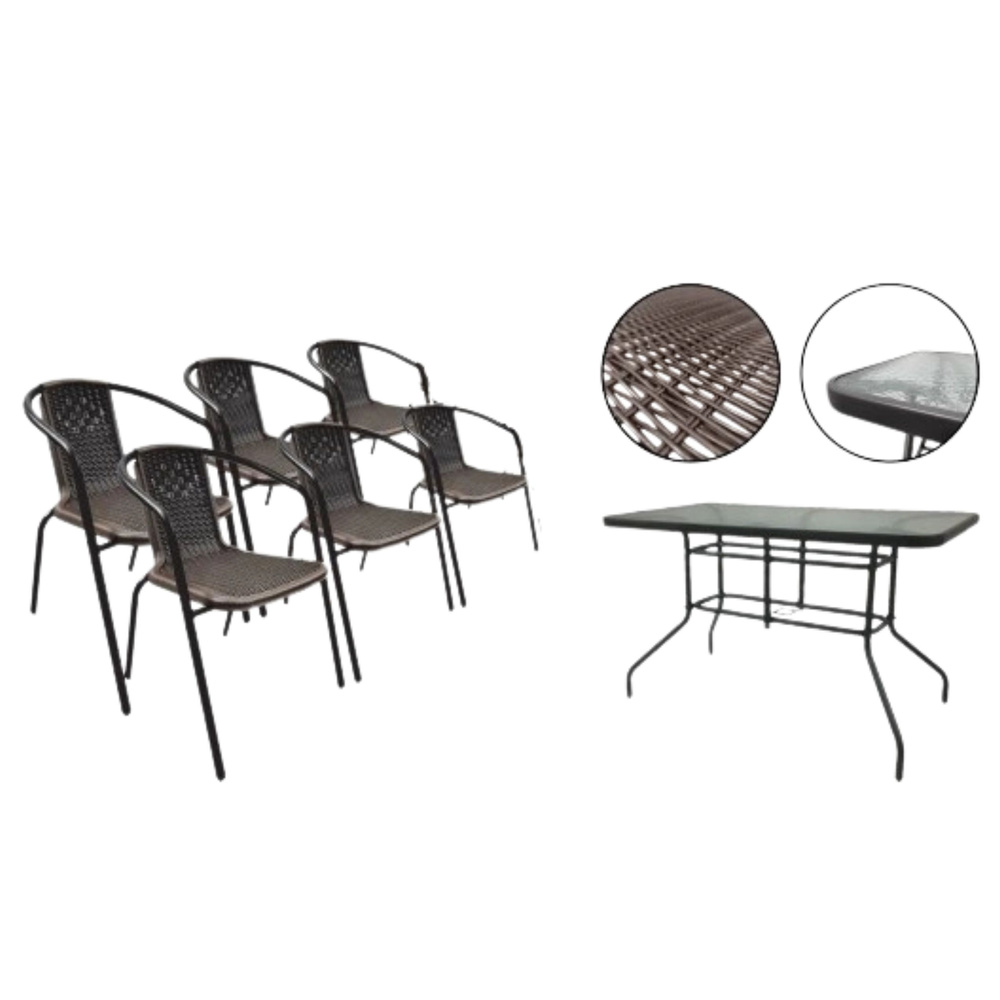 Blat stołu wykonany jest z hartowanego szkła o wzorze falującej wody – elegancki i łatwy w utrzymaniu. Konstrukcja stalowa, malowana proszkowo, gwarantuje stabilność i odporność na warunki atmosferyczne. Krzesła wykonane są z tworzywa sztucznego imitującego technorattan oraz stalowego stelaża, dzięki czemu są lekkie, trwałe i gotowe do użytku od razu po rozpakowaniu – bez skręcania. Co więcej, można je sztaplować, co ułatwia ich przechowywanie i transport.