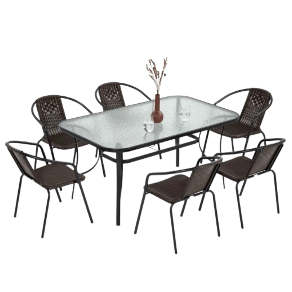 Stylowy i praktyczny zestaw mebli ogrodowych, składający się z dużego prostokątnego stołu ze szklanym blatem oraz 6 wygodnych krzeseł. To kompletne rozwiązanie, które doskonale sprawdzi się na tarasie, balkonie, w altanie lub ogrodzie. Zestaw łączy nowoczesny wygląd z wytrzymałością, oferując komfort użytkowania przez wiele sezonów.