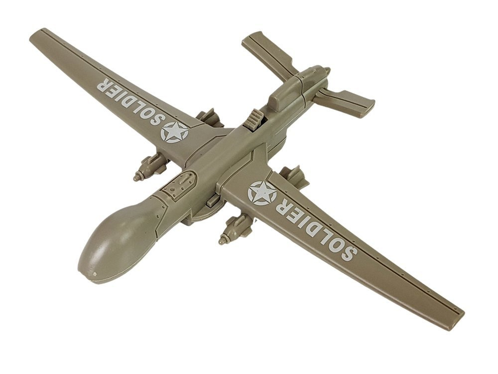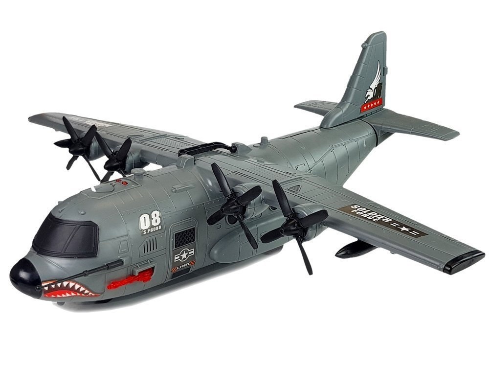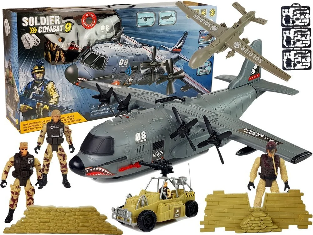 Zestaw z serii militarnej został wykonany z atestowanego, solidnego materiału, jakim jest plastik. Kolorystyka samolotu urozmaicona wzorami moro doskonale nawiązuje do wojskowych barw, co sprawia, że zabawka wygląda bardzo realnie. Samolot odznacza się bardzo dużym rozmiarem — rozpiętość jego skrzydeł to aż 87 cm, natomiast długość - 78 cm. W konstrukcji samolotu uwzględnione ruchome i otwierane elementy. Śmigła znajdujące się na skrzydłach samolotu, są obrotowe, tak samo, jak potrójna broń wystająca z okien maszyny. Na dachu samolotu umieszczone są dwa guziczki, których wciśnięcie uruchamia efekty świetlne i dźwiękowe, czyniące zabawę jeszcze lepszą frajdą! Odgłosy startowania i lądowania umożliwią bardziej realistyczne odczucia, a dźwięki strzału sprawiają, że zabawa jest jeszcze lepsza.