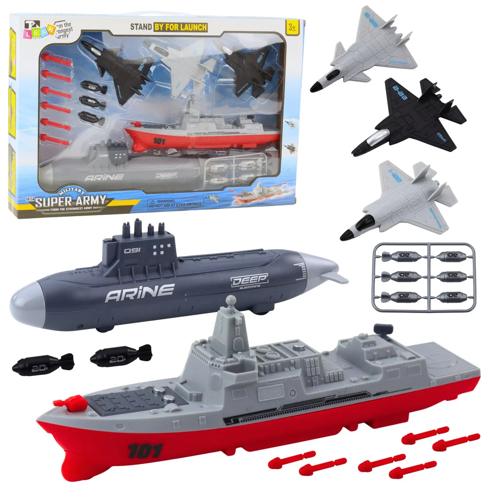 ZESTAW MILITARNY – STATEK, ŁÓDŹ PODWODNA, MYŚLIWCE, AKCESORIA
