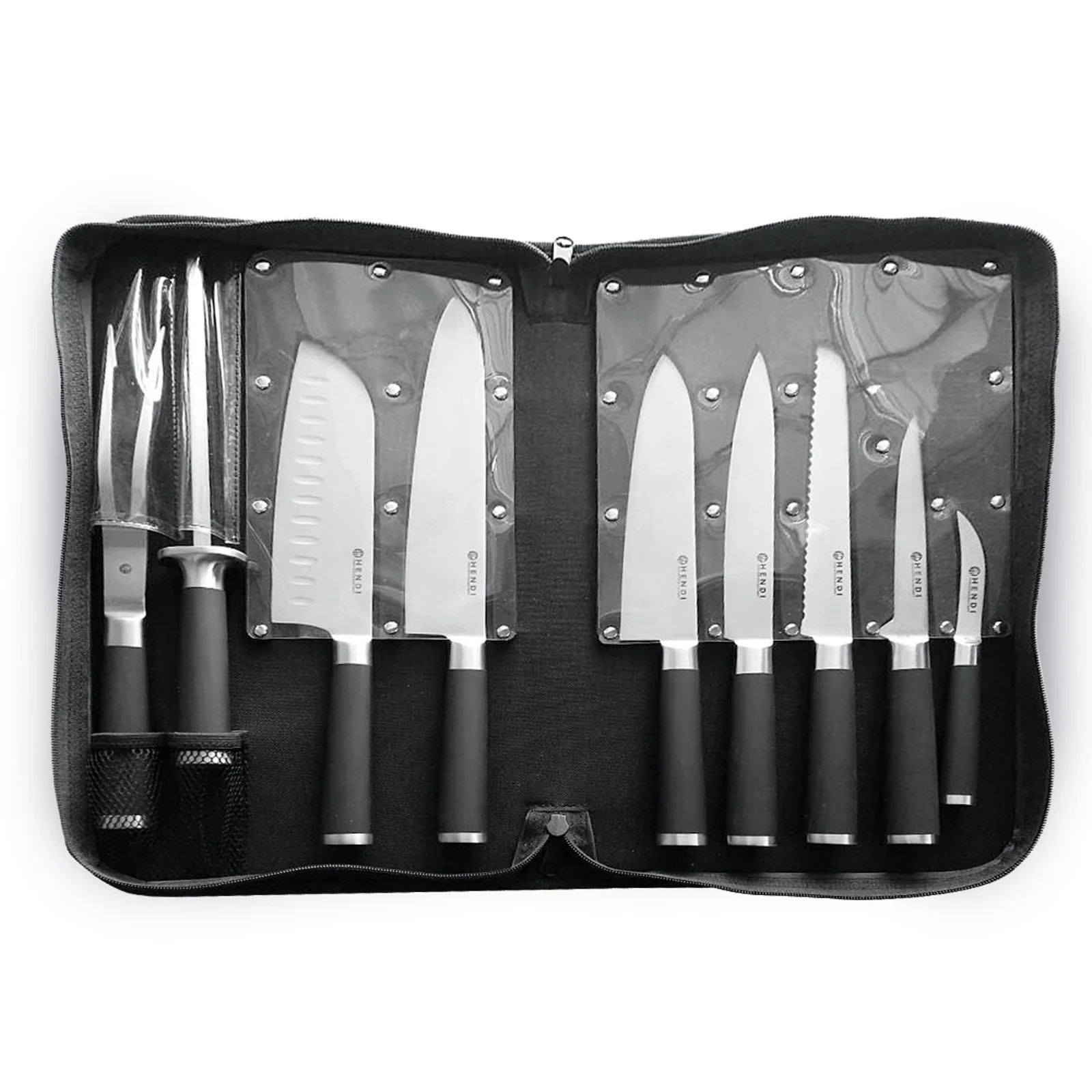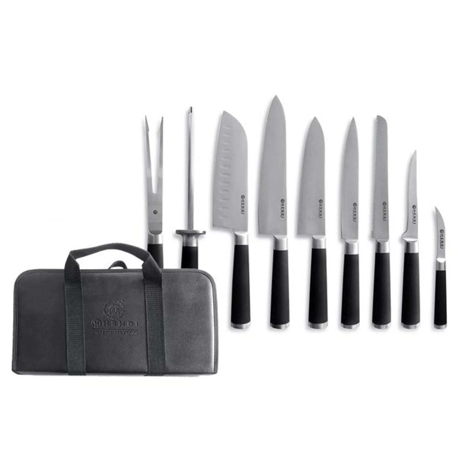 Każdy nóż wyposażony jest w ergonomiczny uchwyt ze stali nierdzewnej 410 z gumowaną powłoką, co zapewnia komfort i pewność podczas krojenia. Zestaw został zapakowany w eleganckie etui, które chroni noże przed uszkodzeniami.