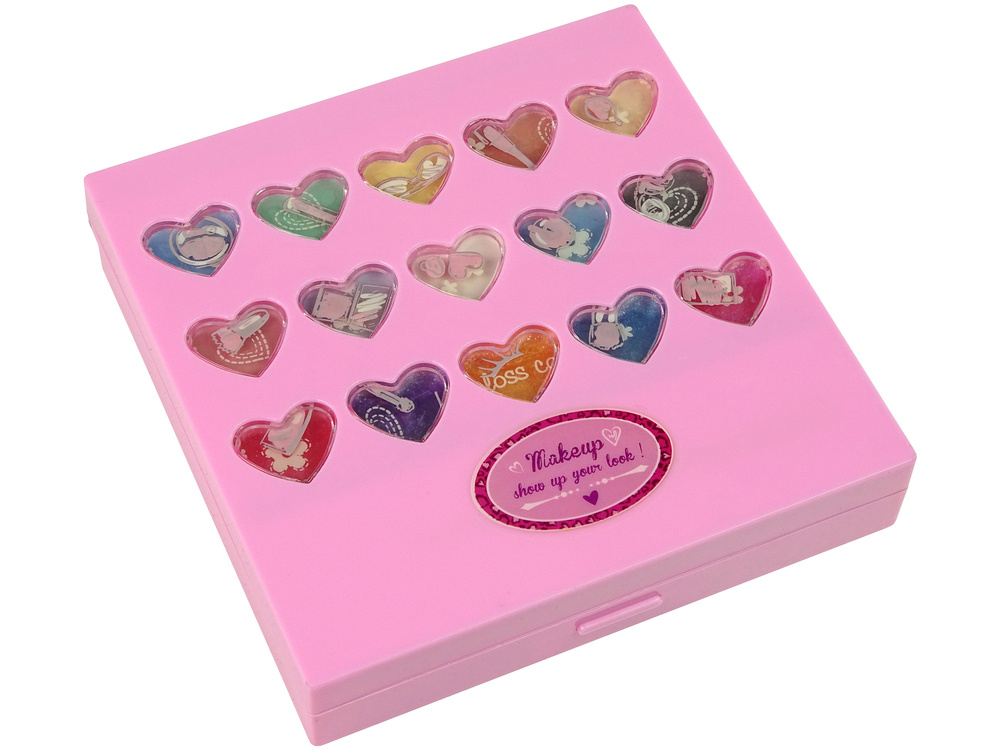 Cudnie rozkładana paletka do makijażu po otwarciu mieści wiele skarbów. Z zewnątrz widać jakie kolory kryje, dzięki przezroczystym serduszkom na wieczku. Wewnątrz ukażą się cienie do powiek, błyszczyki i szminki. W drugiej warstwie znajdują się 4 szminki, z różami oraz pędzelkami. Oprócz niej w zestawie znajdują się inne akcesoria. Lakiery do paznokci, tipsy pozwolą wykonać perfekcyjny manicure. Małe dziewczynki będą się super bawić, poznając tajniki makijażu.