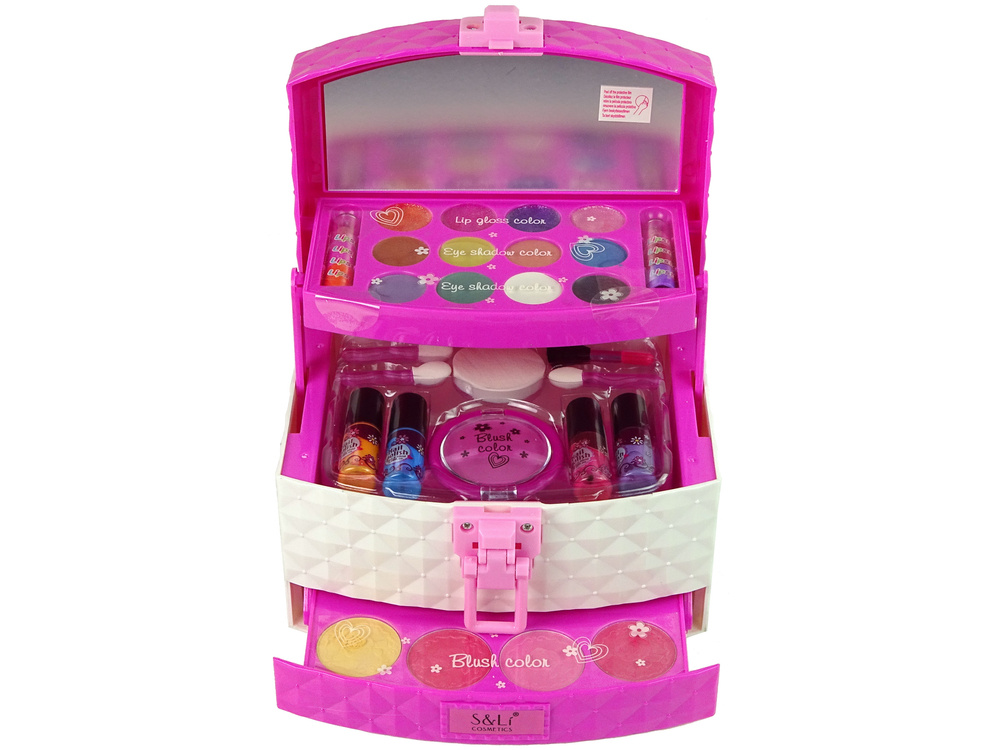 Oferowany zestaw z pewnością ucieszy każda małą damę i pozwoli na wykonanie ciekawych makijaży i stylizacji. Całość znajduje się pięknej kosmetyczce, zamykanej za pomocą klamry. Sam kuferek jest bardzo elegancko i ciekawie wykonany. Kolorystyka różowa i biała wpasuje się do każdego wnętrza, a zwłaszcza do pokoju dziecięcego. Szufladki są wysuwane, każda kryje w sobie wyjątkowe rzeczy. Na wieczku znajduje się lusterko, dzięki czemu bez problemu będzie mogła zabrać szkatułkę ze sobą i malować się w dowolnym miejscu. Idealny zestaw na mały wyjazd.