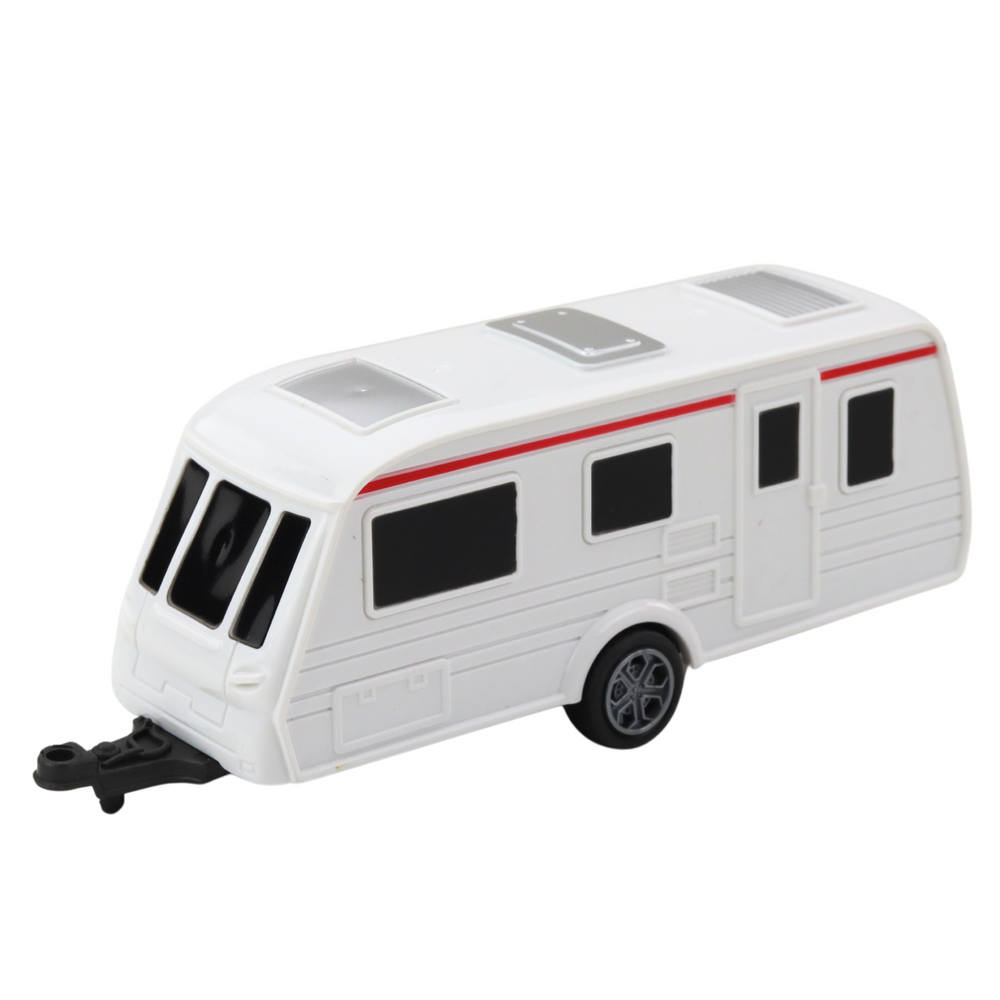 Pojazdy zostały wyprodukowane w technologii die-cast, co oznacza, że nadwozie samochodu wykonano z metalu, a wybrane elementy z wytrzymałego tworzywa sztucznego. Taki dobór materiałów gwarantuje trwałość i estetykę zabawki. Kamper można w łatwy sposób odczepiać od auta, co daje dziecku możliwość tworzenia wielu różnych scenariuszy zabawy – od wakacyjnych wypraw po biwaki i rodzinne podróże.