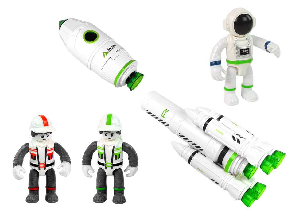 Zabawka posiada certyfikat CE, zapakowana jest w kartonowe pudełko ozdobione kosmicznym motywem. Rakieta zasilana jest trzema bateriami 1,5V AAA, brak w zestawie. Kapsuła zasilana trzema bateriami AG13, w zestawie. Prom kosmiczny zasilany trzem bateriami AG13.