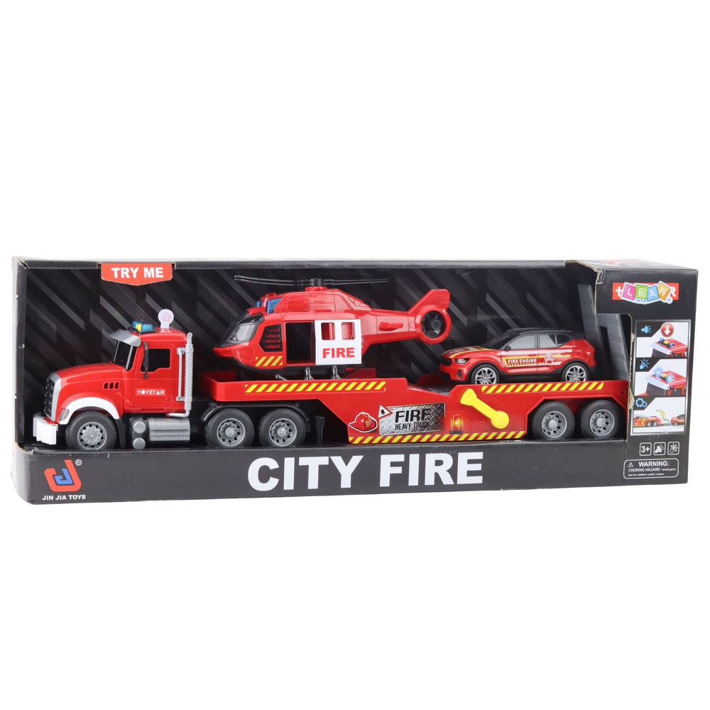 Ciężarówka z lawetą wyposażona została w podnoszoną platformę, dzięki której można wygodnie zsunąć i wyładować samochód strażacki. Helikopter posiada kółka, co umożliwia poruszanie się po podłodze niczym pojazd naziemny. Całość uzupełniają efekty świetlne i dźwiękowe, które uruchamiane są za pomocą przycisków i sprawiają, że zabawa staje się jeszcze bardziej emocjonująca i realistyczna.
