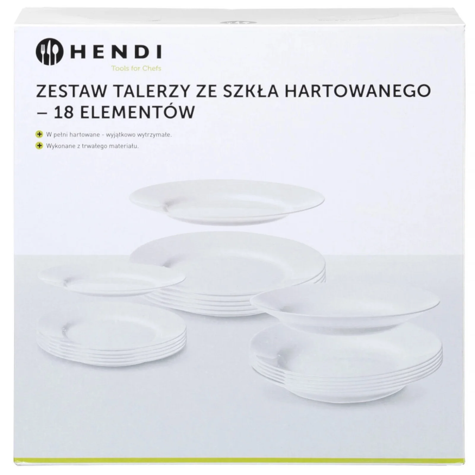 Zestaw talerzy Hendi to doskonały wybór dla restauracji, kuchni i jadalni. W skład zestawu wchodzi 18 elementów, wykonanych z trwałego szkła hartowanego. Talerze te są bardziej odporne na stłuczenia niż tradycyjna porcelana, co zwiększa ich trwałość. Gładka powierzchnia talerzy ogranicza rozwój bakterii, co jest istotne w codziennym użytkowaniu.