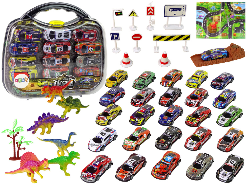 Zestaw Auta Sportowe Resoraki Dinozaury Akcesoria Znaki Drogowe Walizka