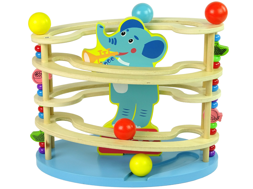 Kolorowa zjeżdżalnia ze słonikiem dla piłeczek to świetna zabawa, która nauczy Twoje dziecko, w jaki sposób kuliste kształty poruszają się po pochyłych powierzchniach. Zjeżdżalnia składa się z 4 poziomów, które musi pokonać położona przez dziecko piłeczka.
