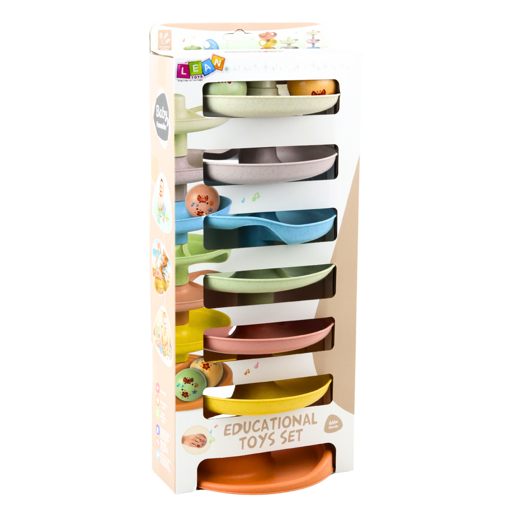 Zabawka edukacyjna tor kulkowy z grzechotkami to idealna propozycja dla najmłodszych dzieci od 6. miesiąca życia. Składa się z siedmiu szerokich, kolorowych poziomów oraz trzech lekkich piłeczek z funkcją grzechotki, które toczą się w dół po spiralnym torze. Zabawka angażuje dziecko zarówno wzrokowo, jak i słuchowo – obserwacja ruchu kulek oraz słyszalne dźwięki podczas toczenia stymulują rozwój sensoryczny i koncentrację.