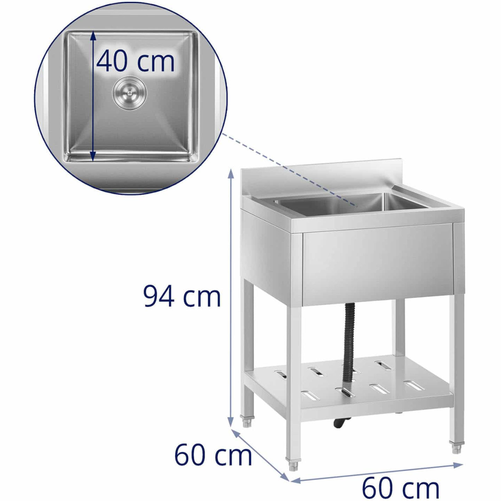Odpływ umieszczony w centralnej części zlewu, z dodatkowym sitkiem, chroni przed zatykanie rur. Rant o wysokości 100 mm zabezpiecza ściany przed zabrudzeniem, co jest istotne w każdej kuchni. Wykonanie ze stali nierdzewnej 304 zapewnia trwałość i odporność na uszkodzenia. Dodatkowo, regulowane nóżki pozwalają na dostosowanie poziomu zlewu nawet na nierównych powierzchniach, co zwiększa jego funkcjonalność.