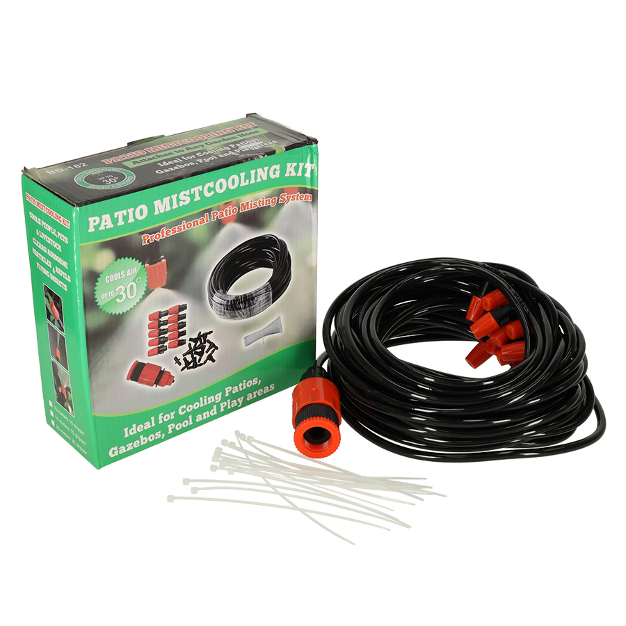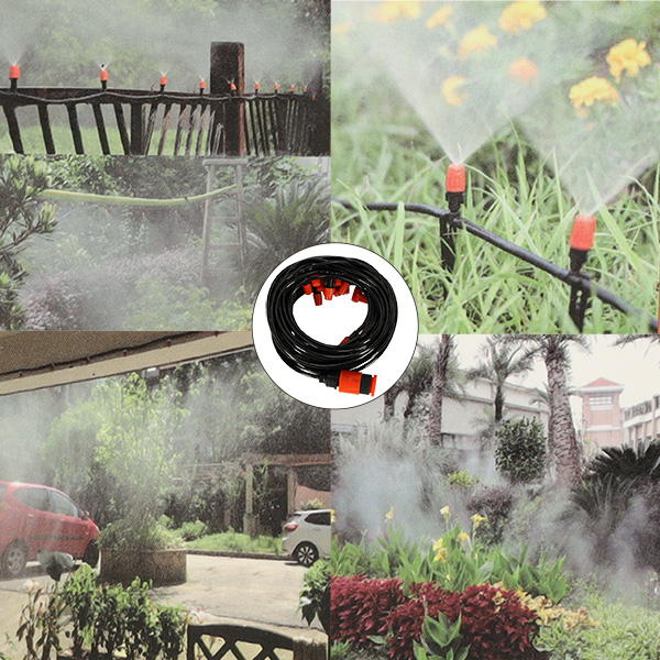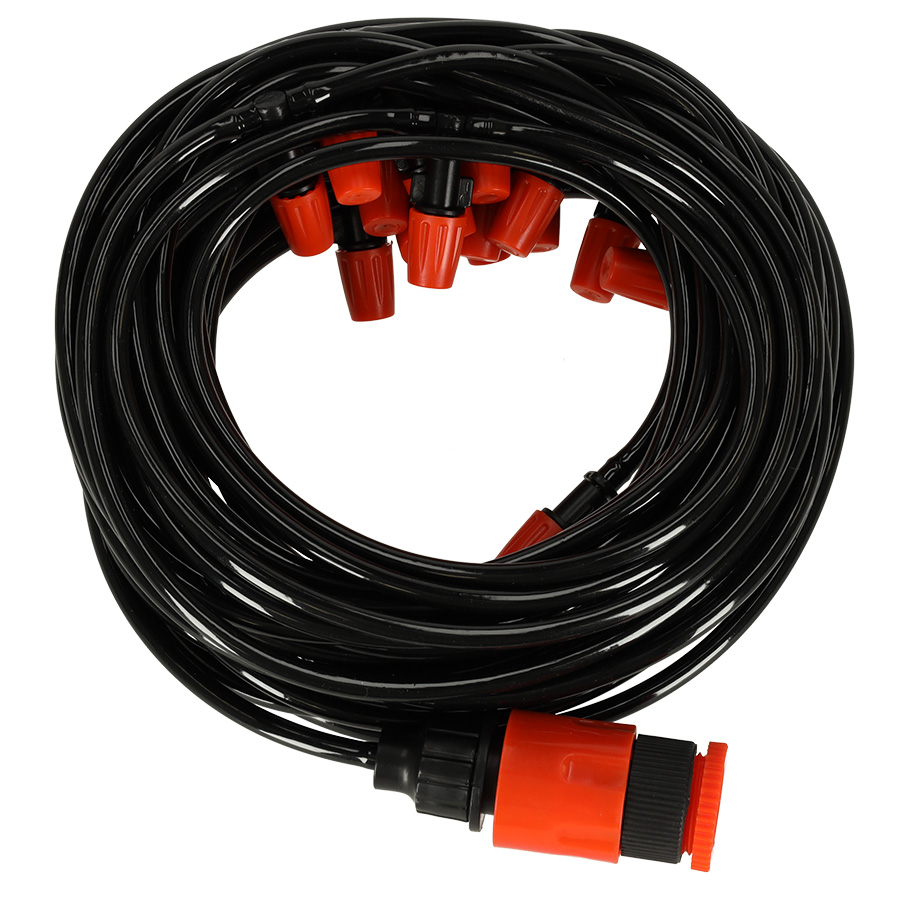Wystarczy podłączyć przewód do węża ogrodowego lub kranu i cieszyć się chłodzącą mgiełką. Zraszacz ma długość 20 metrów i jest wyposażony w 20 dysz, które można regulować, co pozwala na dostosowanie natężenia strumienia wody do własnych potrzeb.