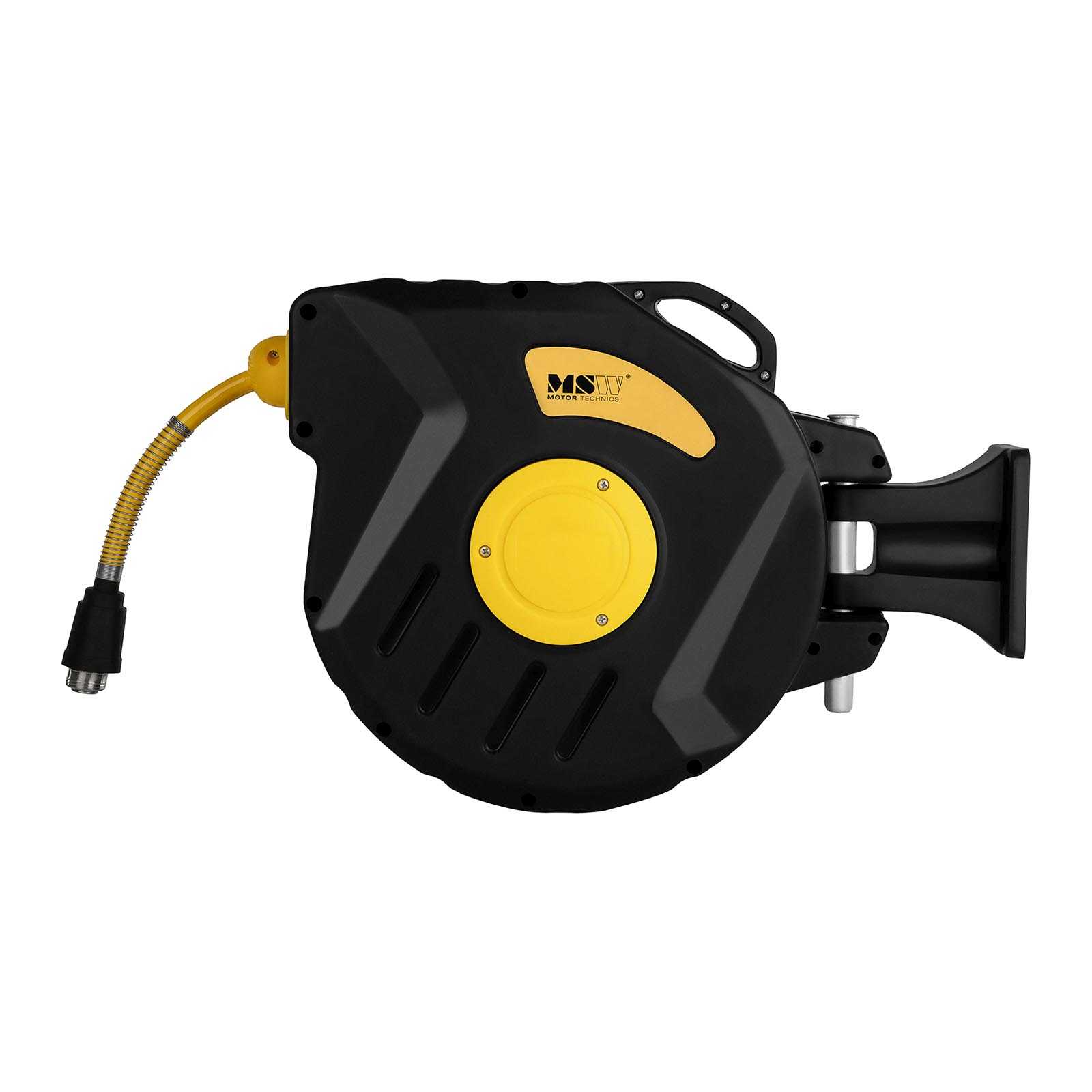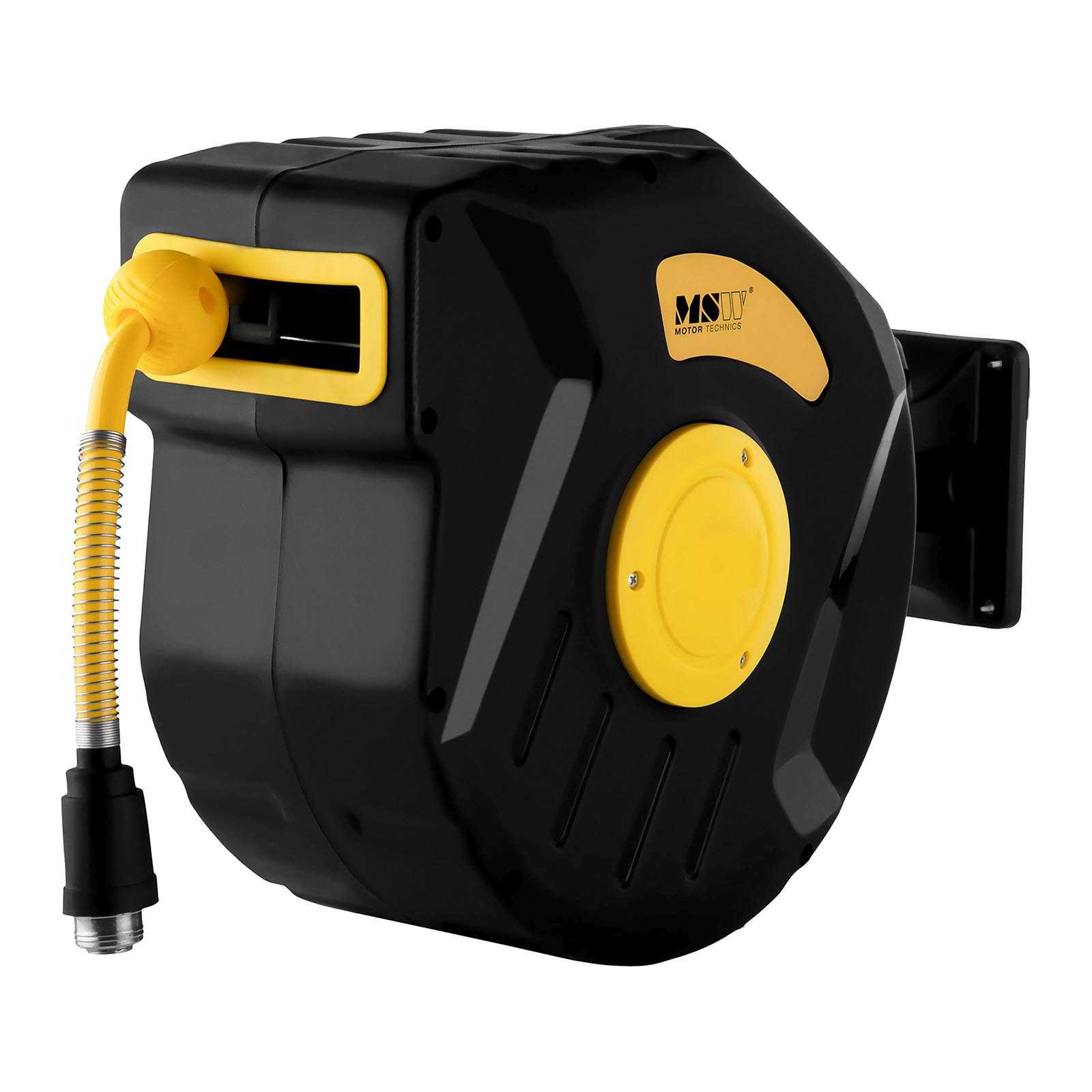 Bęben posiada blokadę, która zabezpiecza wąż przed cofnięciem do wnętrza konstrukcji. Szczelna obudowa chroni przewód przed uszkodzeniami zewnętrznymi. Montaż zwijacza jest prosty, a dołączone akcesoria umożliwiają łatwe przymocowanie do ściany lub sufitu.